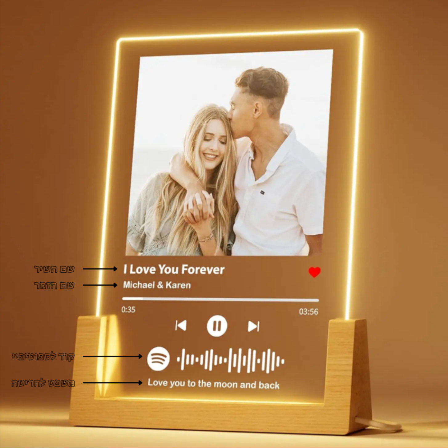 • 💡 תאורת אווירה חמה: בסיס עץ טבעי עם תאורת LED מובנית שיוצרת הילה קסומה סביב התמונה (מושלם כמנורת לילה).